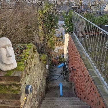 Links vorne am Ende des Parkplatzes geht eine ca. 40m lange Treppe runter: